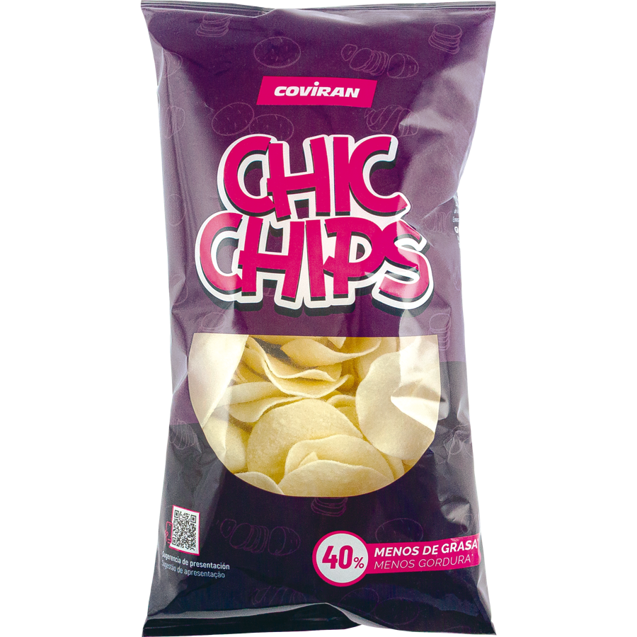 Los Chic chips Covirán son un producto de aperitivo elaborado con un 55% de patata deshidratada frita en aceite de girasol y con fécula de batata y sal.