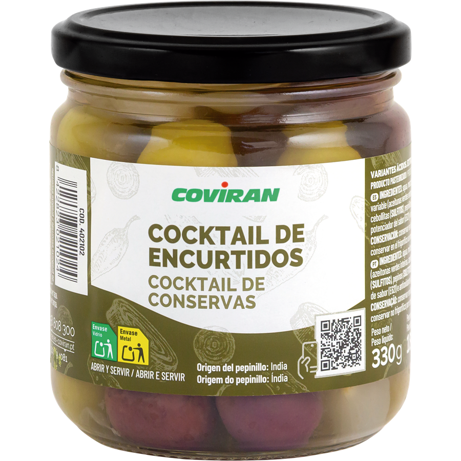 El cocktail de encurtidos Covirán te llena la mesa de alegría con sus pepinillos, aceitunas manzanilla verdes y aceitunas negras.