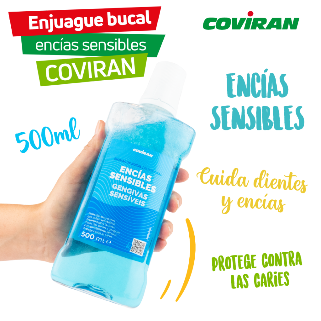 Tienes las encías sensibles y cada vez que vas a tu super Covirán no sabes qué productos comprar. Con enjuague bucal para encías sensibles Covirán tendrás tus dientes y encías cuidados y sin molestias.