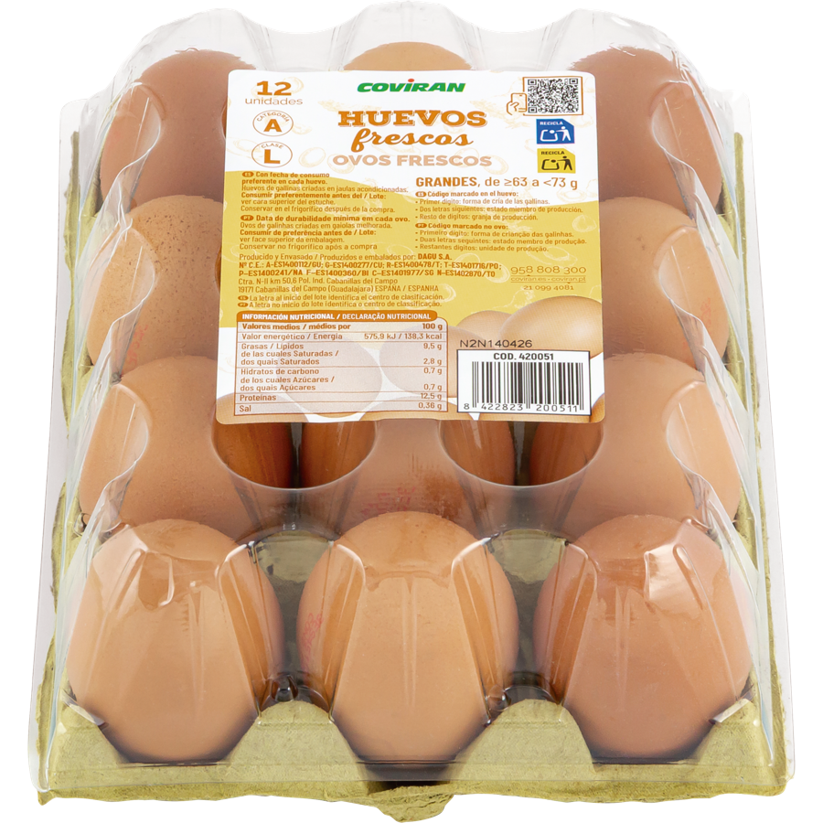 Huevos frescos categoría A. Clase L (de > o igual a 63 g y < a 73 g) 12 unidades.