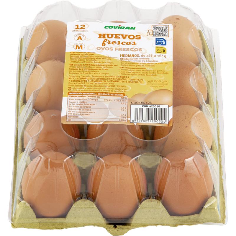 Huevos frescos categoría A. Clase M (de > o igual 53 g < 63 g) 12 unidades.