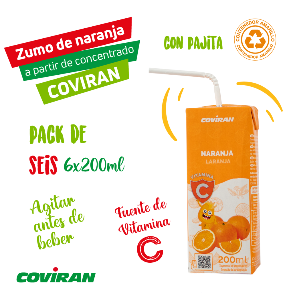 Haz que tu desayuno sea completo con el zumo de naranja Covirán, ahora en este cómodo pack de 6 mini briks.